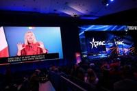 Italian Prime Minister Giorgia Meloni speaks via videolink to the Conservative Political Action Conference (CPAC) on February 22, 2025