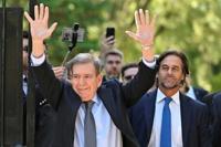 Venezuelan opposition leader Edmundo Gonzalez Urrutia (L) waves to supporters next to Uruguay's President Luis Lacalle Pou in Montevideo