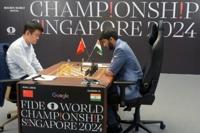 China's chess grandmaster Ding Liren (L) and India's grandmaster Gukesh Dommaraju (R) compete in the final game of the 2024 FIDE World Champio…