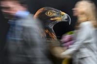 Attendees walk past a Golden Eagle photograph during the United Nations Climate Change Conference in Baku