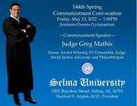 News Judge Greg Mathis to speak at Selma University Commencement Nathan Prewett Nathan Prewett May 4, 2022 Judge Greg Mathis, known for his appearances on television as "Judge Mathis", will speak at Selma University's 144th Spring Commencement Convo…