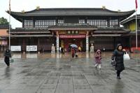 Women wearing long wigs and ornate traditional dresses milled around a pebbled courtyard, stopping to snap photos under a pavilion, as the melodious strumming of the Chinese zither played in the background.