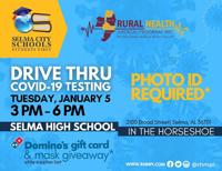 News Drive-thru COVID testing to be held at Selma High School Nathan Prewett Nathan Prewett Jan 4, 2021 Rural Health Medical Program will hold a drive-thru COVID testing tomorrow on Jan. 5 at Selma High School.Â