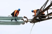 Perched 45 metres (148 feet) high, young apprentice electricians replace a connection atop a pylon. In the UK, National Grid recruitment is at…