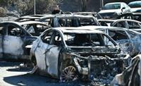 Fire retardant covers a car and sidewalk in the Mandeville Canyon neighborhood