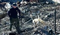 A cadaver dog, from the Los Angeles County Sheriff, sniffs through the rubble of beachfront properties destroyed by the Palisades Fire along P…