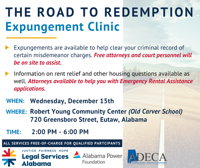 Legal Services Alabama (LSA) will host an expungement clinic at the Robert Young Community Center in Eutaw on Wednesday, Dec. 15.