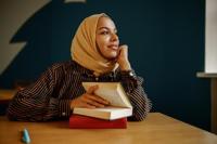 Lifestyle The Most Therapeutic Kind of Me-Time Dec 22, 2024 Arab female student in hijab holds textbook in university cafe. Muslim woman with books sitting in library. Religion and education
