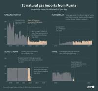 Graphic showing European Union natural gas imports from Russia by route, according to data from Bruegel