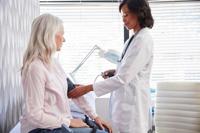 Lifestyle Follow-Up Test For High Blood Pressure Condition Not Worthwhile, Researchers Say May 6, 2025 Woman Patient Having Blood Pressure Taken By Female Doctor In Office