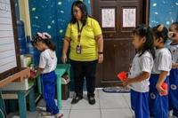 Teacher Lolita Akim with her students during a water break at an elementary school at Baseco in Manila on March 21