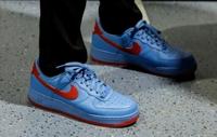 A person wears sneakers in the colours of Germany's far-right Alternative for Germany (AfD) party during a congress in Riesa