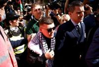 Kneecap rapper Liam O'Hanna, who uses the stage name Mo Chara, arrives at court wearing a Palestinian keffiyeh scarf
