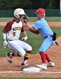 Getting the out, Morgan Academy catcher Davis Vardaman makes the tag at home plate to get an out on the Lee-Scott AcademyWarriors in game one …