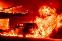 A car burns outsie a home in the Altadena area of Los Angeles County
