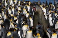 A seal surrounded by penguins on the sub-Antarctic Crozet Islands