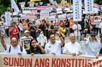 People protest following the Senate's decision on the impeachment trial of Philippine Vice President Sara Duterte