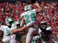 Sept. 21, 2024; Columbus, Ohio, USA; Marshall Thundering Herd running back Ethan Payne (28) scores a touchdown during the first half of an NCA…