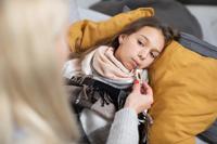 Lifestyle U.S. Sees Most Child Flu Deaths Since 2009 May 5, 2025 Close up top angle view of cute teen girl, with thermometer in mouth, lying on sofa or bed with scarf around neck, suffering from flu or tonsi…