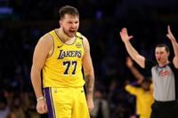 Luka Doncic reacts after making a three-pointer in the Los Angeles Lakers thrilling overtime win over the New York Knicks