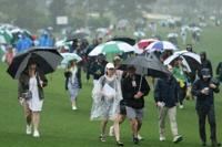 Spectators evacuate Augusta National Golf Club after the first practice round for the 89th Masters was suspended due to bad weather in the area