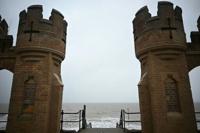 View of the North Sea between the turrets of the entrance to the old pier in Withernsea, on the east coast of England near where a collision b…