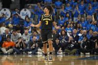 Jan 7, 2025; Los Angeles, California, USA; Michigan Wolverines guard Tre Donaldson (3) reacts against the UCLA Bruins in the second half at Pa…