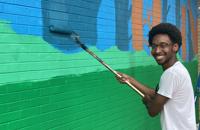 Local artist and teacher Derrick Thomas is painting a mural on the side of McRae-Gaines Learning Center.