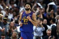 Jamal Murray of the Denver Nuggets reacts during the Nuggets' overtime victory over the Oklahoma City Thunder in game three of their NBA playo…