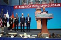 U.S. Secretary of Transportation Sean Duffy (R) speaks alongside airline executives, including (2ndR-L) CEO of United Airlines Scott Kirby, Ro…