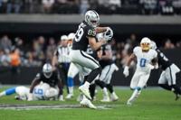 Jan 5, 2025; Paradise, Nevada, USA; Las Vegas Raiders tight end Brock Bowers (89) catches the ball in the second half against the Los Angeles …
