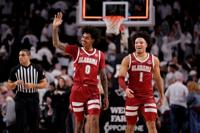 Jan 11, 2025; College Station, Texas, USA; Alabama Crimson Tide guards Labaron Philon (0) and Mark Sears (1) react after the final buzzer agai…