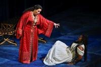 Opera singers Judith Kutasi (L) and Angel Blue perform during Giuseppe Verdi's "Aida" at New York's Metropolitan Opera