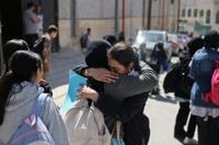 Palestinian schoolgirls embrace as they leave a UNWRA school