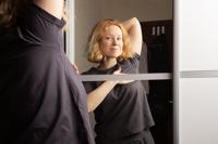 Breast cancer self-examination, woman examining breasts at home, treatment and health care.