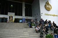 Journalists wait outside Bangkok's Criminal Court as former leader Thaksin Shinawatra is due to face charges of insulting the monarchy