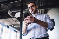 Puzzled business analytic received message from company customer connecting to 4g wireless for mobile chatting, Caucasian man in optical glass…