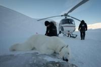 With one foot braced on the helicopter's landing skid, a veterinarian lifted his air rifle, took aim and fired a tranquiliser dart at a polar bear.