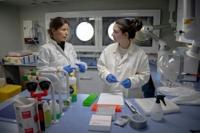Heli Routti (L) and Laura Pirard studying polar bear fat samples