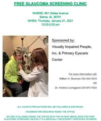 News Free glaucoma screening to be held Jan. 19 Nathan Prewett Nathan Prewett Jan 3, 2023 A free glaucoma screening will be held on Jan. 19 sponsored by Visually Impaired People, Inc. and Primary EyeCare Center.Â