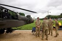 Soldiers gather next to an US Army AH-64 Apache helicopter on display on the National Mall during the Army 250th anniversary celebration