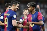 Lamine Yamal celebrates with Robert Lewandowski after scoring in Jeddah