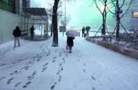 Footprints are seen as pedestrians walk along a snow-covered street during snowfall in central Seoul
