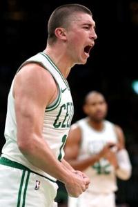 National News Cavs hold off Heat to book NBA playoff berth Maddie Meyer Mar 5, 2025 Boston's Payton Pritchard celebrates on his way to 43 points in the Celtics victory over Portland