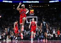 Immanuel Quickley of the Toronto Raptors celebrates a three-point basket in an NBA victory over the Brooklyn Nets