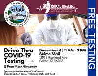 A free drive-through testing for COVID-19 will be held at Selma Mall on Dec. 4, sponsored by the Selma City Council.