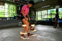 Woman chinlone player Phyu Sin Phyo practises for a solo Tapindaing performance during a training session in Yangon
