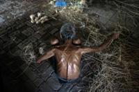 A man prepares cane to be weaved into a chinlone ball at a workshop in Hinthada township in the Irrawaddy delta region