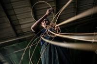 A man weaves cane into a traditional Myanmar chinlone ball at a workshop in Hinthada township in the Irrawaddy delta