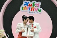 Chayapa "June" Rattanakewil (right) and Thitapat "Pang" Chainarongwir pose for photos after registering their same-sex marriage